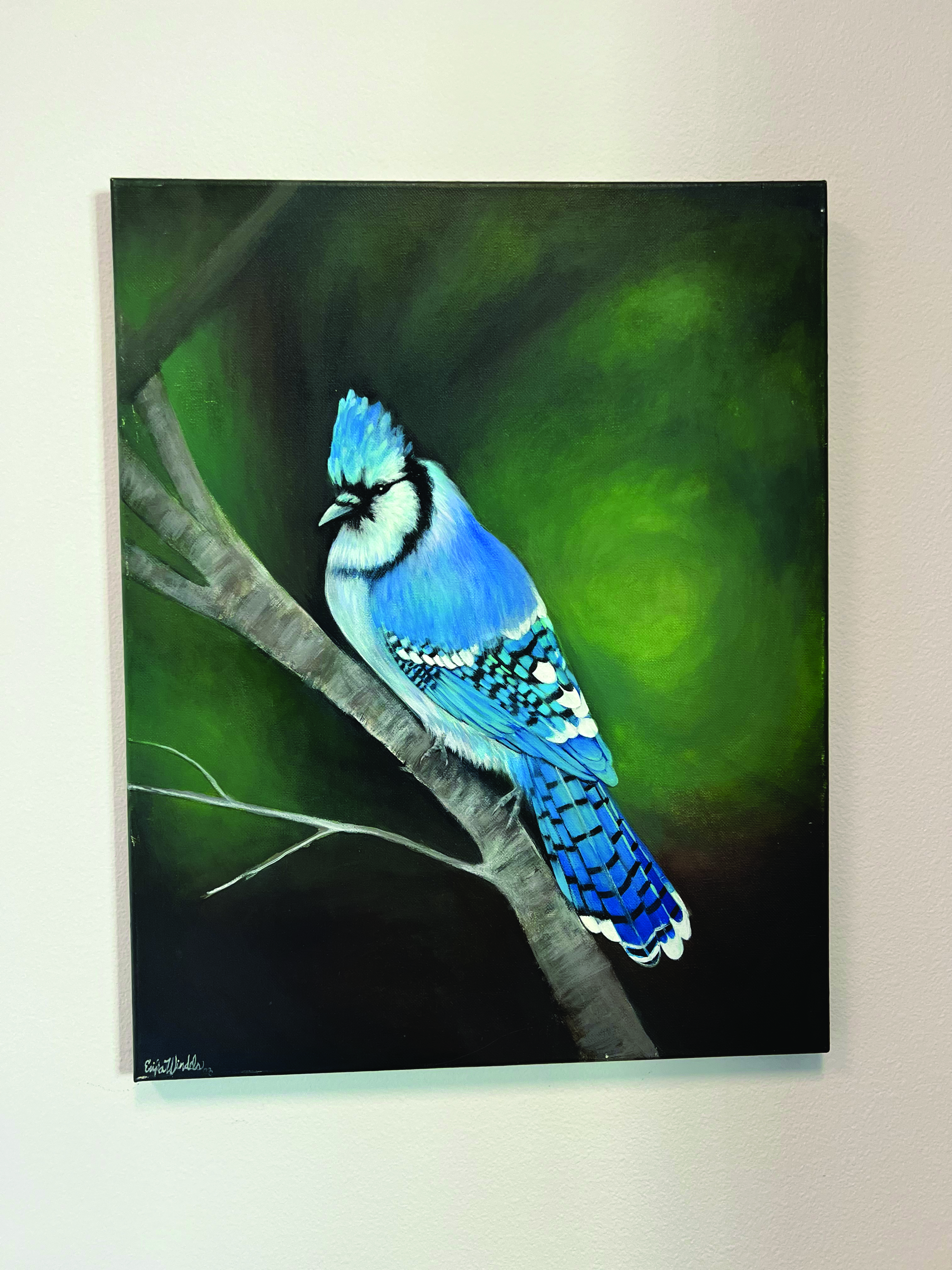 A painting of a blue jay hangs on the wall of a crisis advocacy office at Children’s Home Shelter for Family Safety in Sioux Falls. It’s a beautifully- rendered, finely-detailed and exquisitely simple portrait of a lone bird in the spotlight against a deep green and black background.