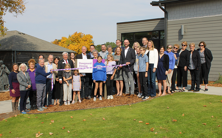 After Dennis's speech, members of the Sioux Falls Area Chamber of Commerce presented Michelle and Dennis with a commemorative plaque for this special occasion. Everyone then lined up in front of the new Daugaard Dining Hall sign and the ribbon was cut, marking this new chapter in CHS history.