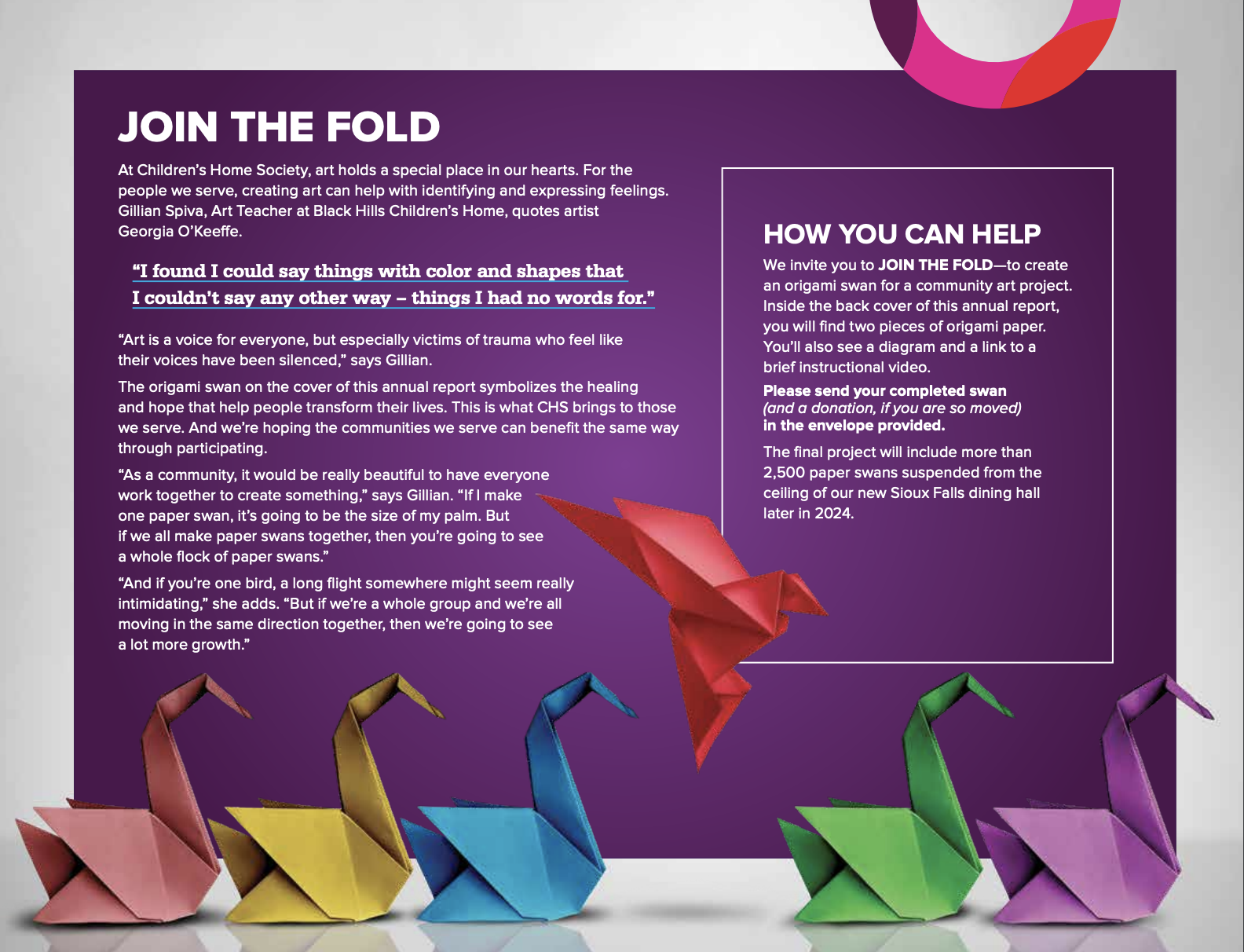 Appropriately, you’ll find origami paper tucked into the Annual Report, along with an invitation to fold swans. Our goal is to transform more than 2,500 paper swans into a community art project in the new Sioux Falls dining hall! You’re invited to Join the Fold—and you will hear more about this very soon.