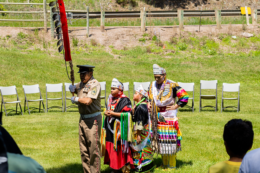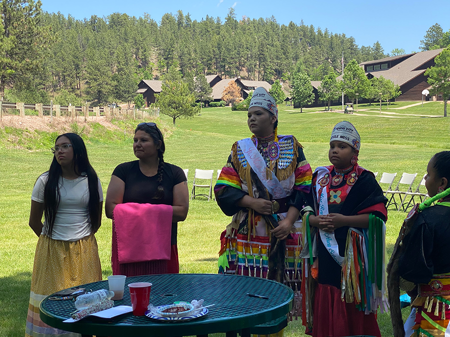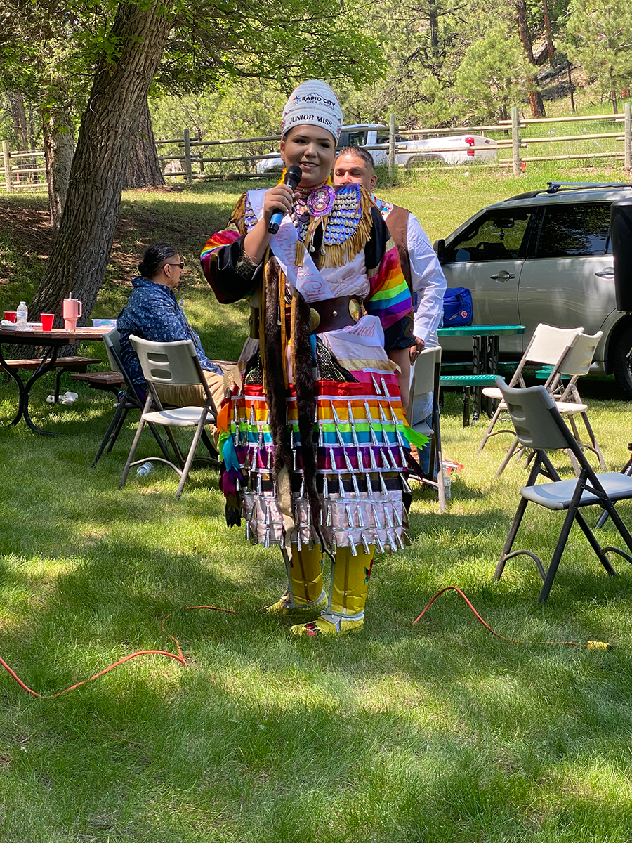 In attendance were royalty from the Rapid City Area Schools Wacipi—Junior Miss, Little Miss and Mini Miss—who graced the powwow with their presence and brought high energy to the dances. Junior Miss Layla Bear Saves Life, and her family generously brought extra jingle dresses so more children could take part in the experience.