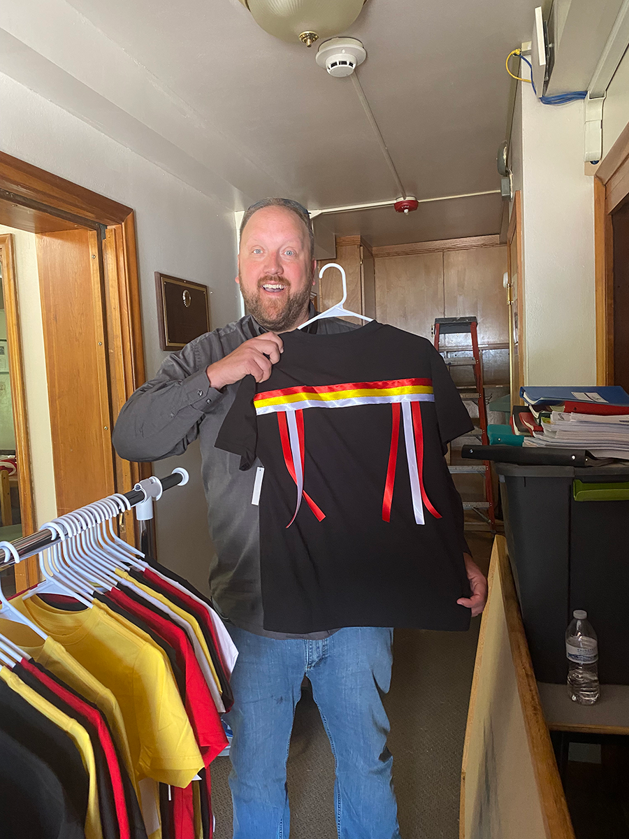 Assistant Director of Development Andrew Hewitt, shows one of the ribbon shirts that Jonni Hertel made.