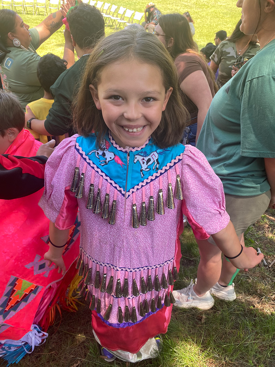 This little girl was all smiles in a pink jingle dress. Junior Miss Rapid City Area Schools Wacipi Layla Bear Saves Life and her family generously brought extra jingle dresses for the children to use during the powwow.