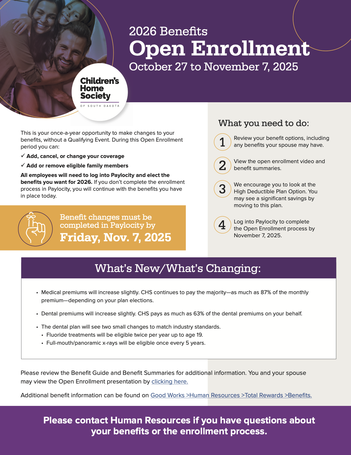 Open Enrollment for the 2026 benefit year will take place October 27–November 7 through Paylocity. This is your opportunity to review your benefits and prepare to make any changes for the upcoming year.