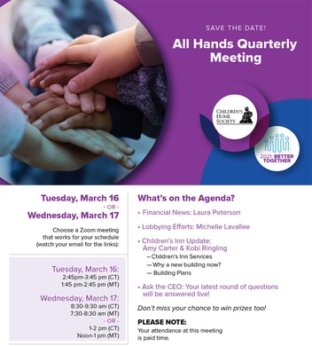 All Hands on Deck - 1st Q 2021 Children's Home Society of South Dakota Mar 24, 2021 12:00:00 AM All Hands on Deck - 1st Q 2021 < Return to GOOD WORKS Home Page Posted on March 24, 2021, General News Did you miss the 1st Quarter 2021 All Hands meeting? Watch it here. < Return to GOOD WORKS Home Page General News