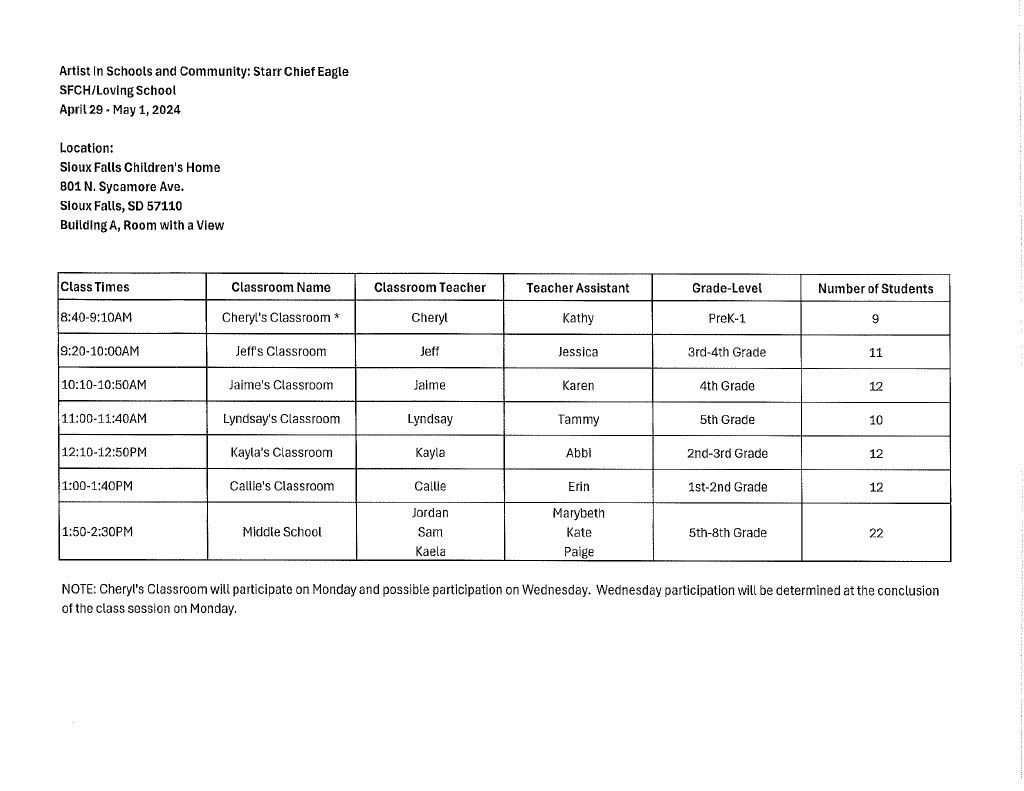 All class sessions will take place in the Administration Building, Room with a View/Kitchen. This schedule will be consistent each day of the residency – resulting in most classes having the opportunity to work with Starr three times during the week.
