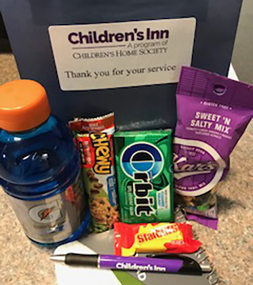 It was during this week that Erin Amundson, Outreach Advocate at Children’s Inn, led the charge to fill 380 goodie bags with things like Gatorade, candy, gum, notebooks, and pens. These filled bags were then delivered to local law enforcement by Children’s Inn staff.
