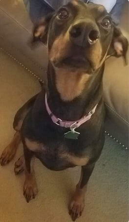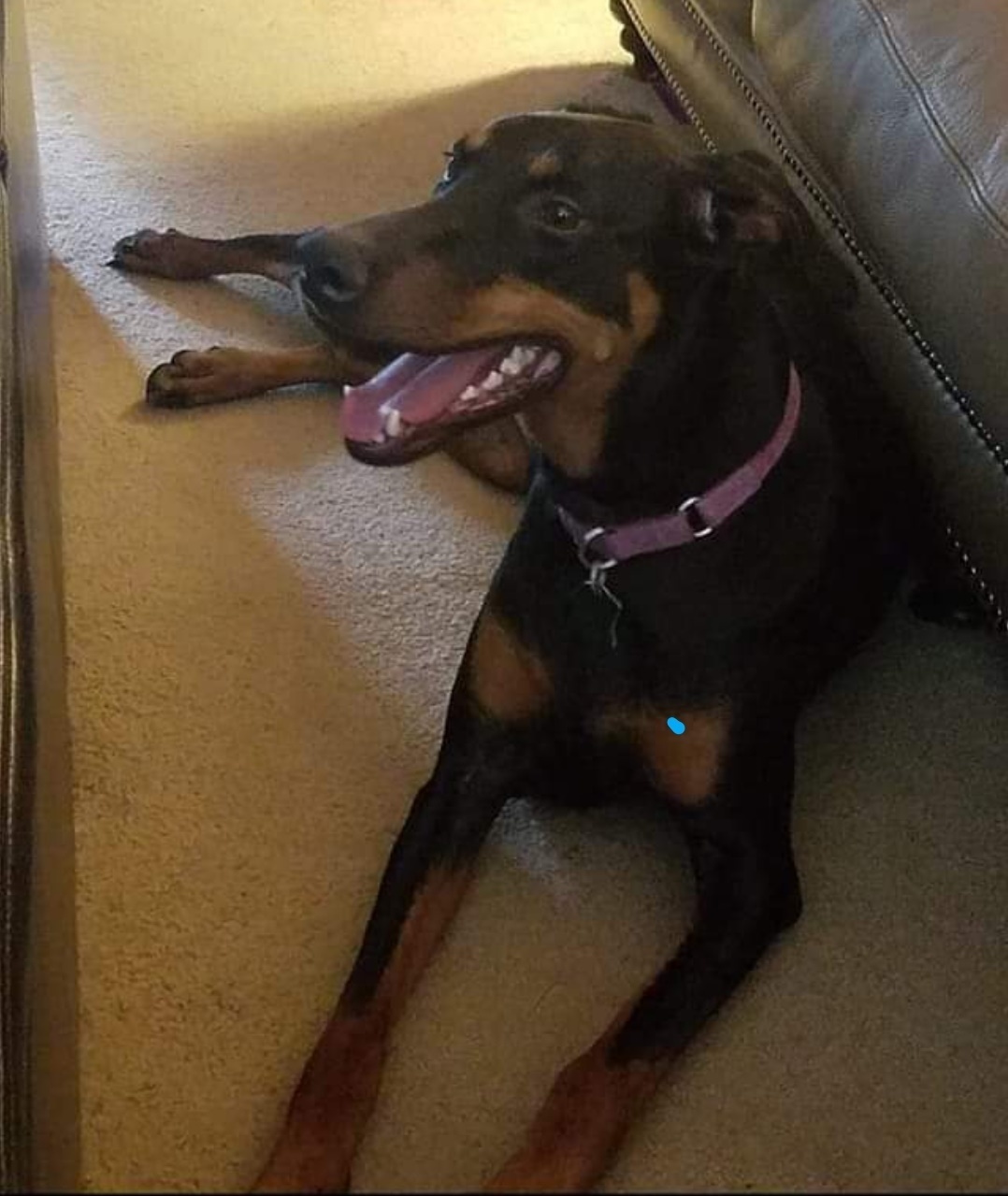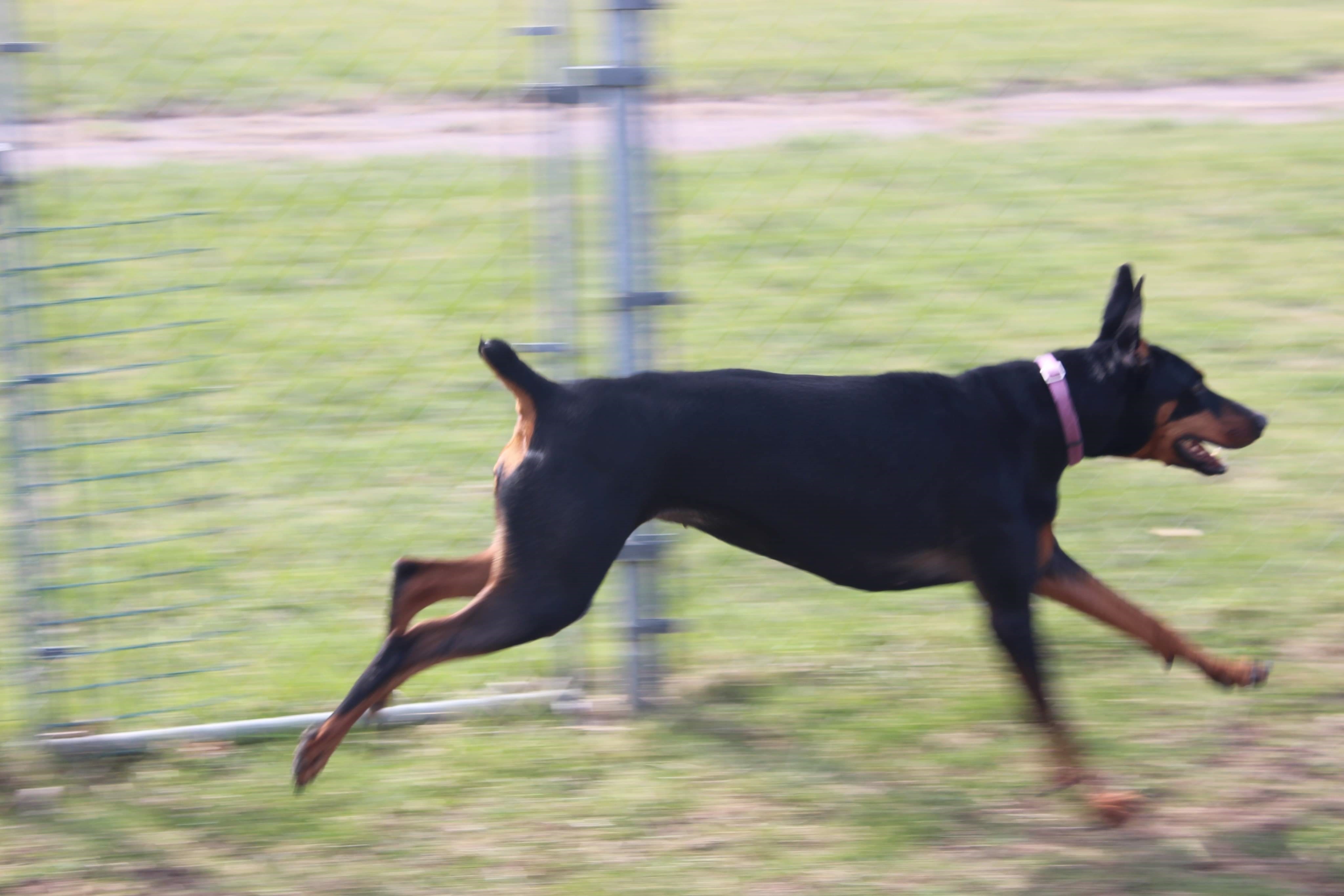 Short bio/adoption story: Lilli is our “special needs” dog. She had a rough start in life because her mother rejected her and terribly injured her at birth. She had surgery when she was a couple of days old and was bottle fed by a well-intentioned breeder. Lilli was then purchased by an elderly couple who only trained her to potty outside. She had full run of the house along with a couple of Yorkies. She was never taught to sit, stay, lay down, etc., so she had some terrible habits. Because she never had interaction with a momma dog to teach her, she doesn’t quite understand the cues that a dog normally gets from another dog, so she struggled socially. She was severely underweight and had terrible anxiety issues. Once she proved to be too much for the couple to handle, they took her to the vet at 18 months to have her put down. A vet tech talked the couple into surrendering the dog to the clinic instead of putting her down and that vet tech took her on as a project. She worked with Lilli to socialize her with other dogs, taught her the basic commands and then decided Lilli was more work than she had anticipated. She contacted my husband’s cousin who is a Doberman dad living in Las Vegas at that time and asked if he could help find a home for Lilli. I happened upon that post and found out the dog was in Mitchell. I have had two Dobies in the past and fell in love instantly. I called the lady who told me Lilli’s story and that made me even more eager to meet her. We loaded up our two dogs, drove to Mitchell to see how they all got along and they all played for hours. We came home with Lilli. She is so much better since we’ve gotten her, she is a beautiful, HUGE girl, 74 lbs. of solid muscle and we love her so much. She is still a work in progress EVERY day, but we would never give her up for anything.