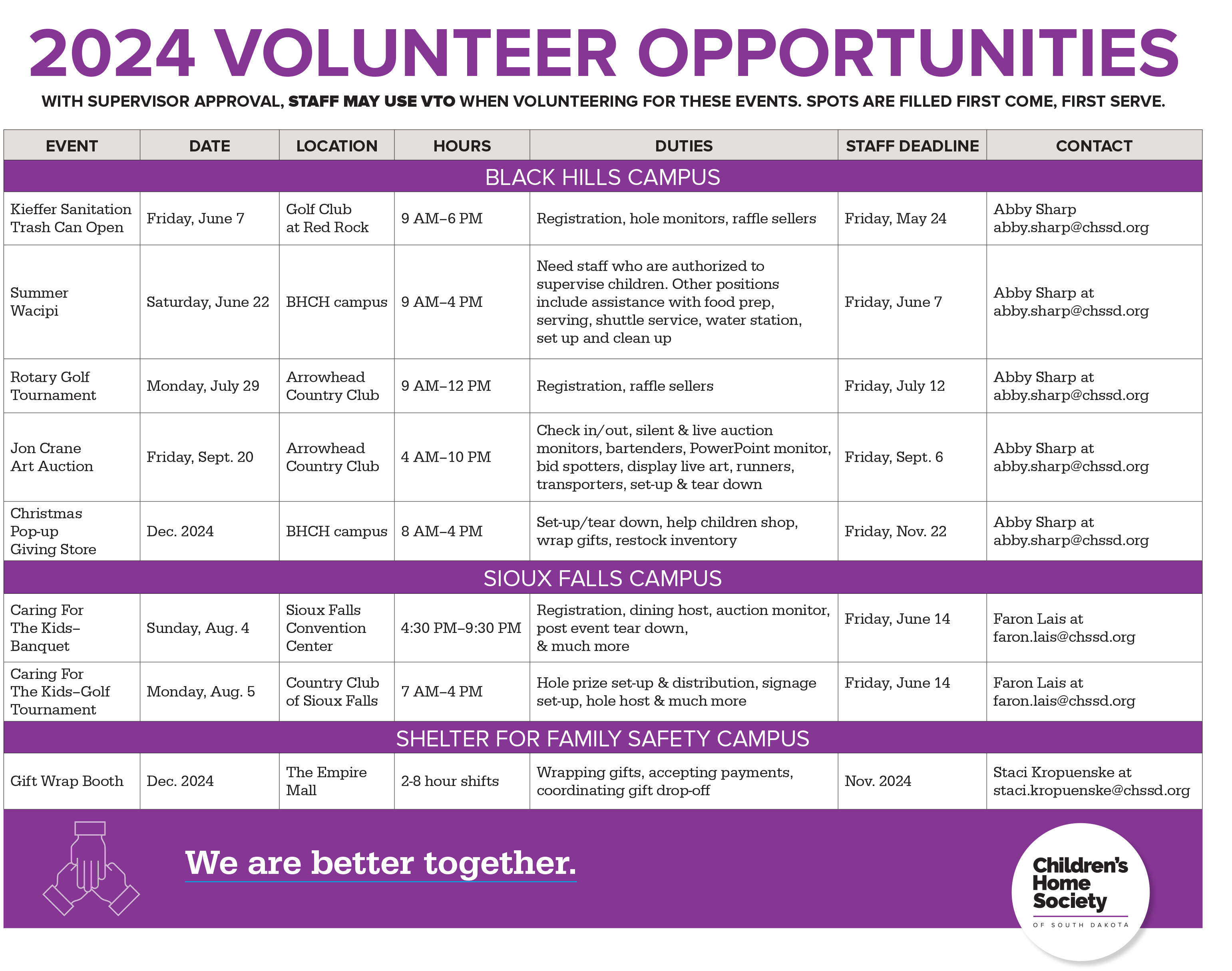 Events and Volunteer Opportunities Children's Home Society of South Dakota May 14, 2024 12:00:00 AM Events and Volunteer Opportunities < Return to GOOD WORKS Home Page Posted on May 14, 2024, Volunteer At the May All Hands meeting, you heard about numerous volunteer opportunities at CHS events that are held throughout the year. Here's a handy reference link! Download as PDF < Return to GOOD WORKS Home Page Volunteer