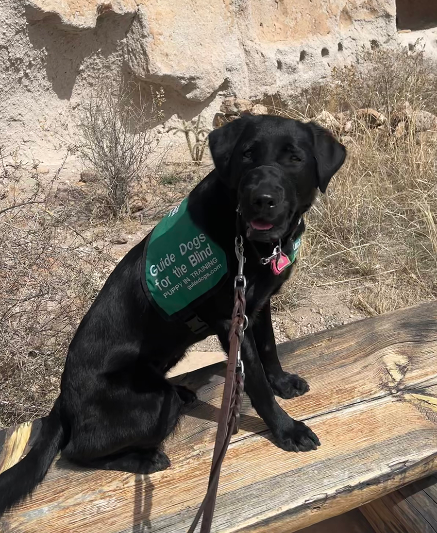 Short bio/adoption story: Tamari was handed to me at eight weeks old as my puppy to train in my role as a volunteer puppy raiser for Guide Dogs for the Blind. The goal was for her to be a Guide Dog for someone visually impaired. Guide Dogs for the Blind named her–they select a letter for each litter of puppies–she was the "T" litter. Something very interesting is that they do not reuse names of current puppies in training or guides, so the names get a bit interesting. For example, her brother’s name is Taco.