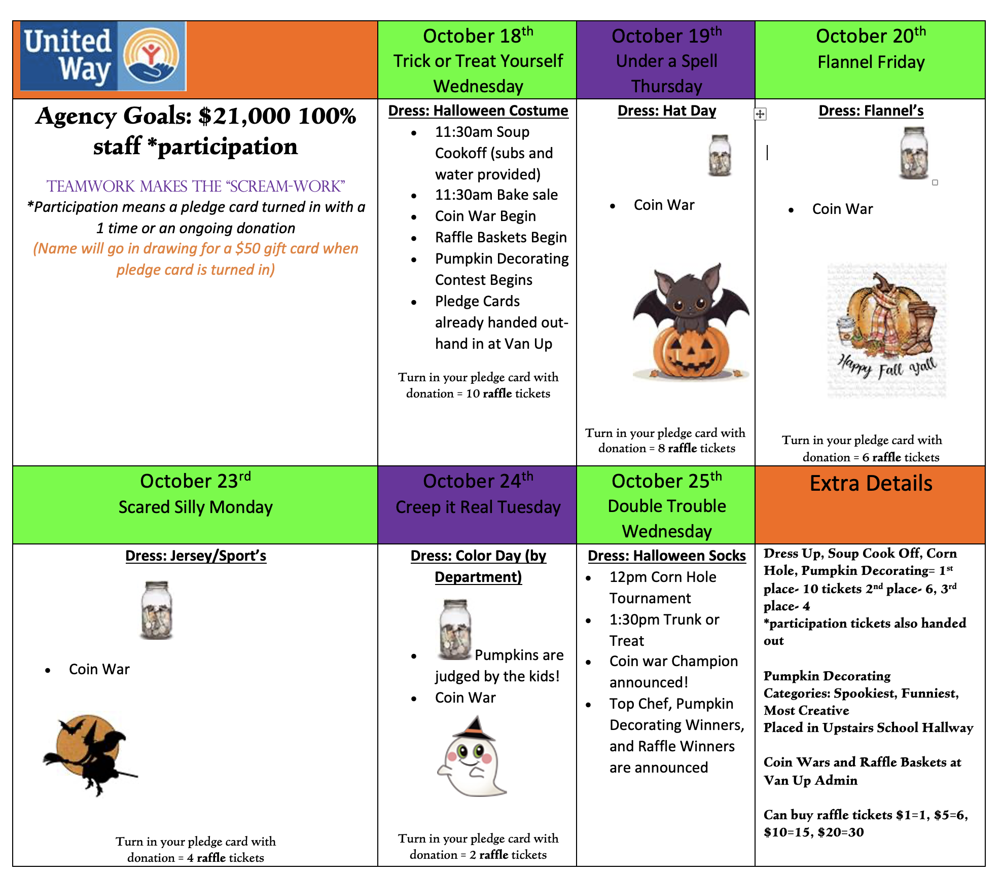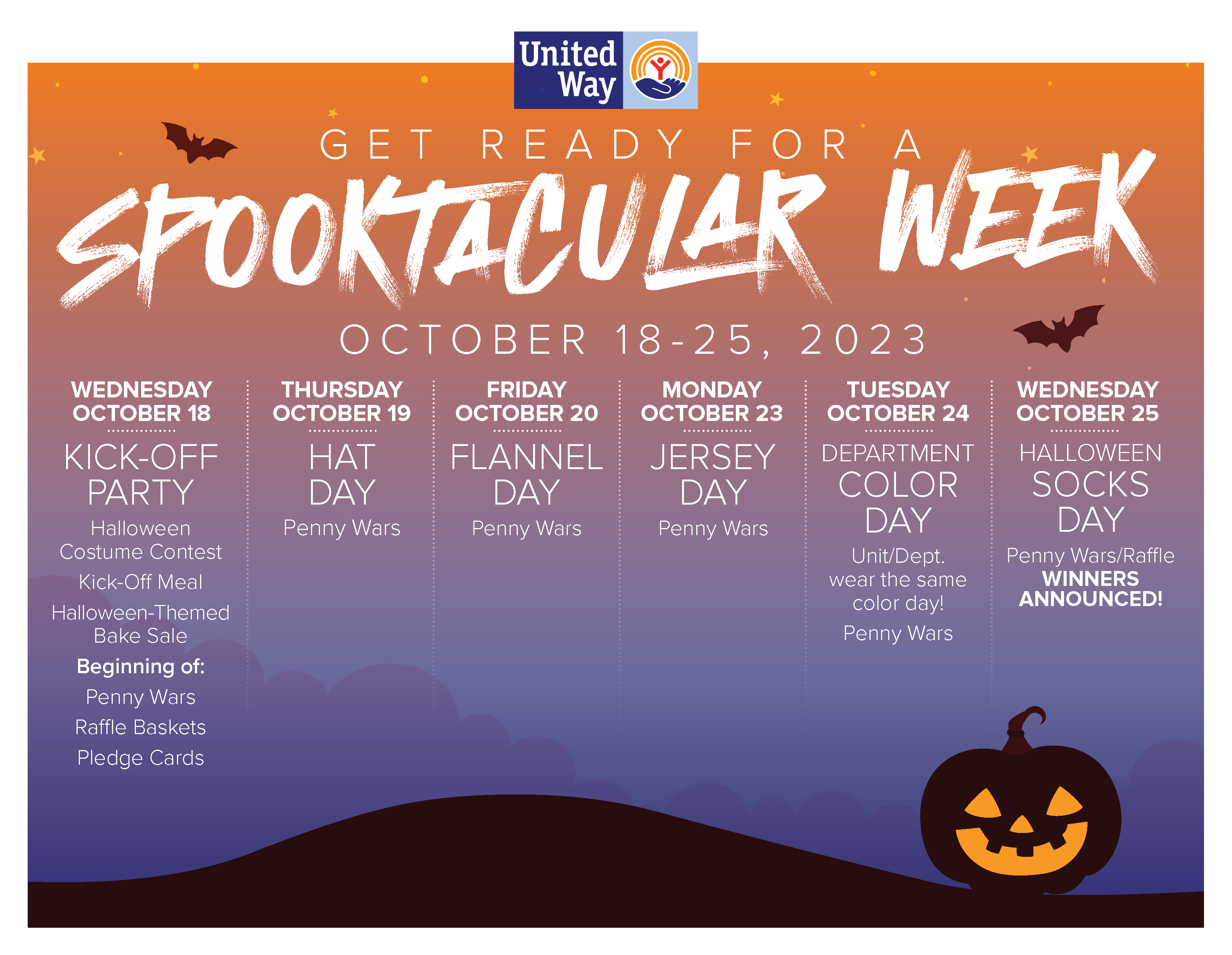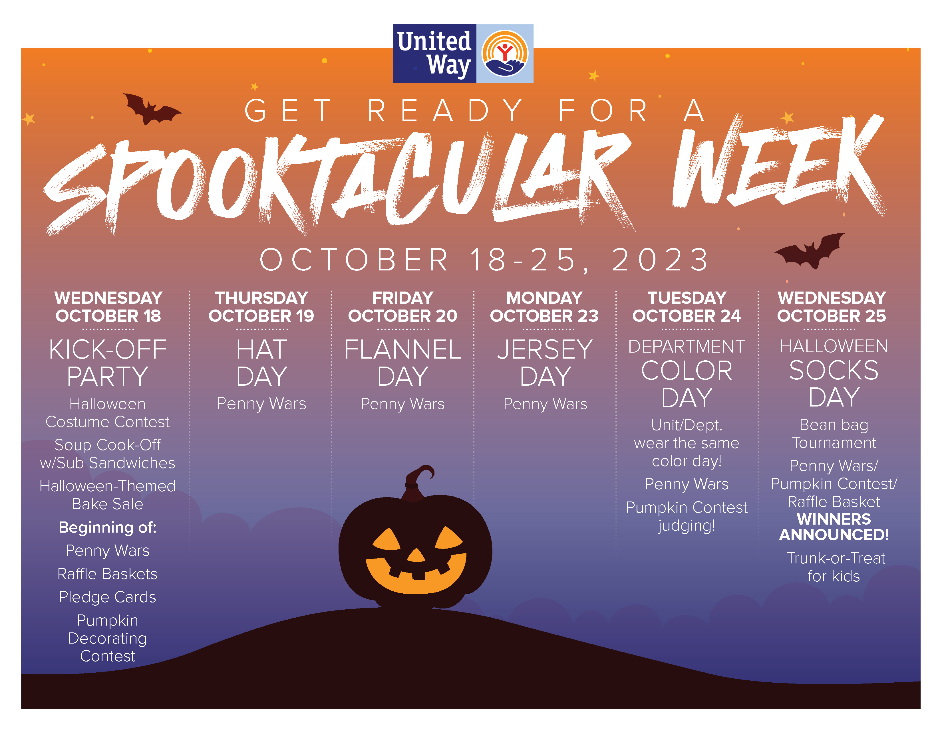 Be sure to save the dates (October 18–25) for a fun week of United Way Campaign activities. This year’s theme is Halloween/Fall Festivities, and a video will be shown at our kick-off party on Wednesday, October 18.