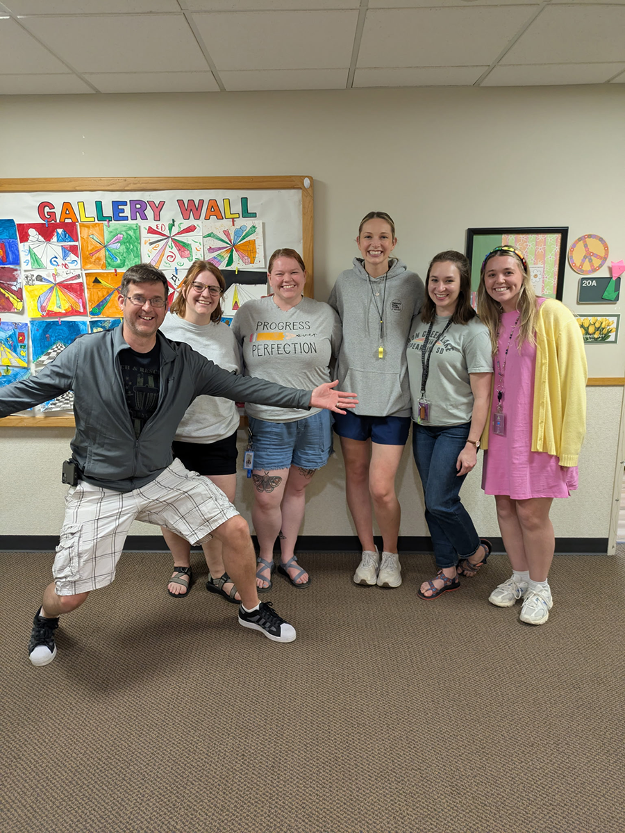 We are over the rainbow for our teachers! Top left: Teacher Lyndsay Pruss, Teacher Assistant Chelsie Anderson, Classroom Teacher Intern Kaela Larkin and Teacher Assistant Paige Knuth. Bottom left: Teacher Assistant Erin Kuestermeyer, Teacher Assistant Emma Neu, Teacher Callie Hruby, Teacher Assistant Skyler Paulsen and Teacher Hope Darley.
