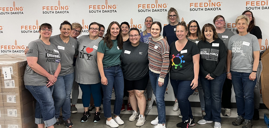 Staff from Children’s Home Shelter for Family Safety and Bright Start spent a morning packing food boxes at Feeding South Dakota.