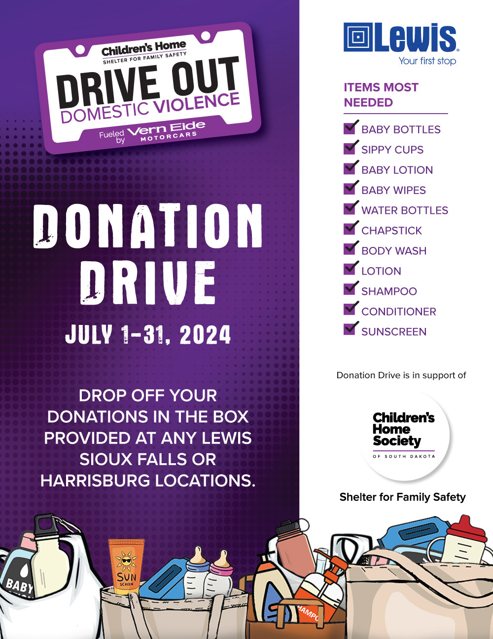 Donation Drive at Lewis Drug: We are also partnering with Lewis Drug to hold a Donation Drive during the month of July to collect needed items for Shelter. Stop by any Lewis Drug location in Sioux Falls or Harrisburg to drop off your donations in the marked bins.