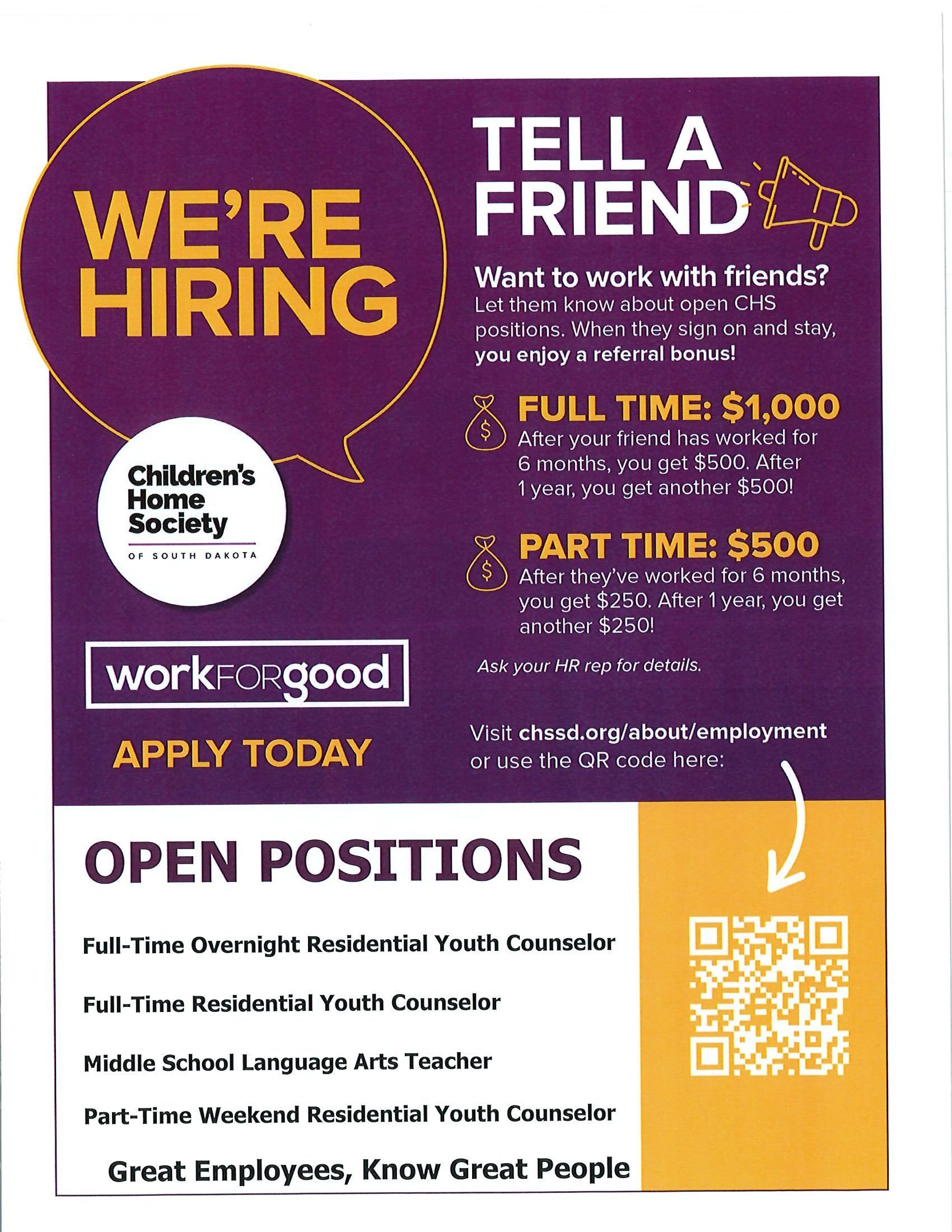 Refer A Friend! Children's Home Society of South Dakota Aug 13, 2023 12:00:00 AM Refer A Friend! < Return to GOOD WORKS Home Page Posted on August 13, 2023, HR News Need a passive income source? Work with your friends—and get that nice referral bonus (up to $1,000)! Scan the QR code to learn more. < Return to GOOD WORKS Home Page HR News