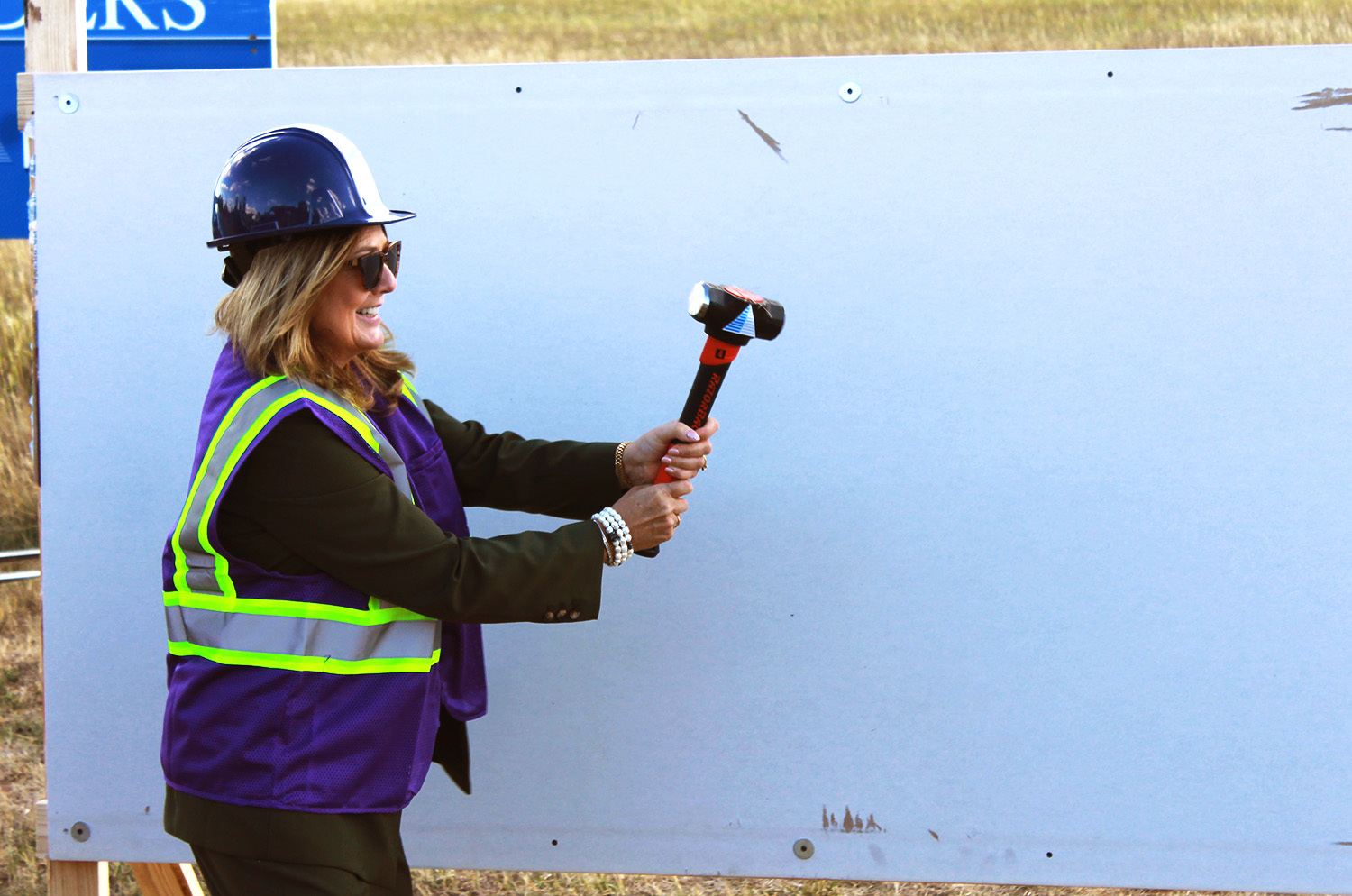 Following the speeches, members of the CHS leadership team suited up in purple hard hats and vests and took turns smashing the sheetrock wall. Once everyone had a chance to break the wall, Elevate Rapid City brought out a pair of gigantic scissors to cut the ceremonial ribbon.
