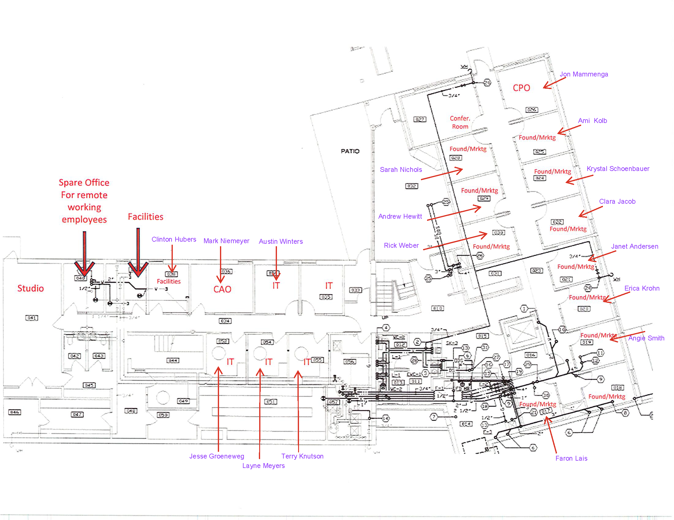 The schematics above show where each department operates in the admin building. Volunteer Development Coordinator Faron Lais and Grant Specialist Angie Smith, are located downstairs in the admin building with the Foundation/Marketing team.