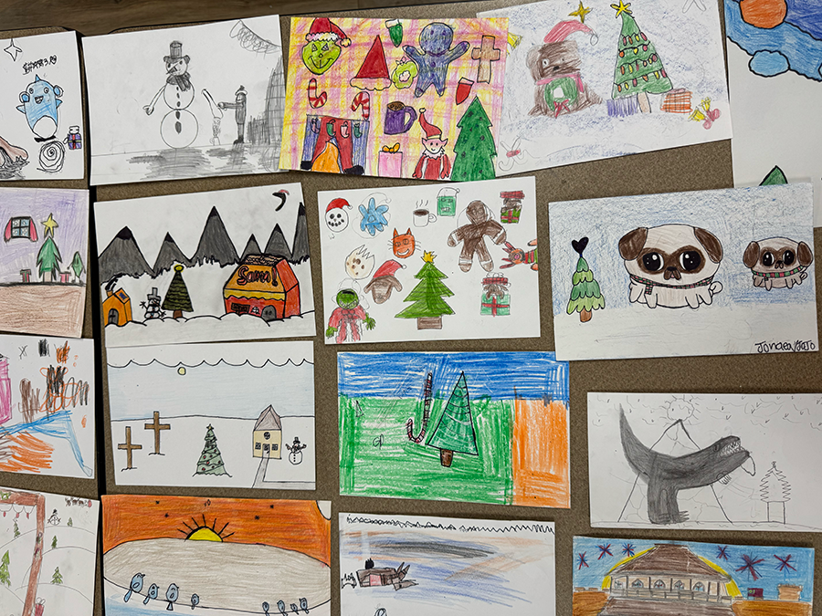 Excitement was in the air when students discovered the contest would be happening again this year. Students shared with SFCH Art Teacher Rylee Lehmkuhl that they were eager to design a card and look forward to the contest every year. This was Rylee’s first year with the project and she had her students start working on the cards in July. To help the kids get into the Christmas spirit, she provided examples of holiday cards and instructions on how to draw different Christmas and winter objects like snowmen, stockings, Santa and the Grinch.