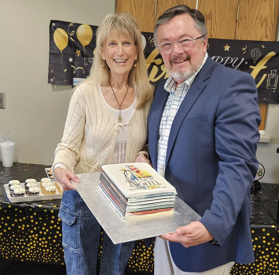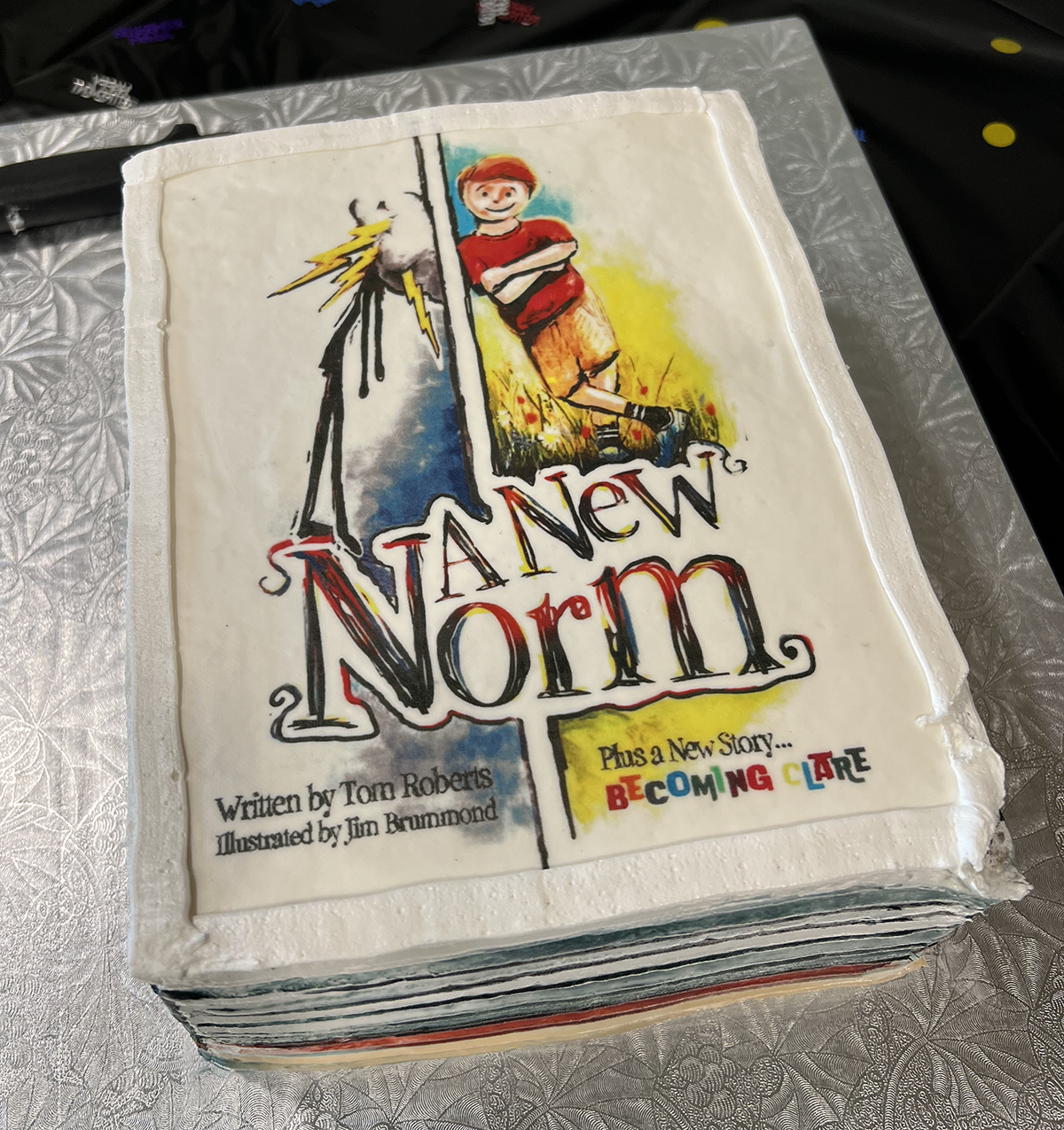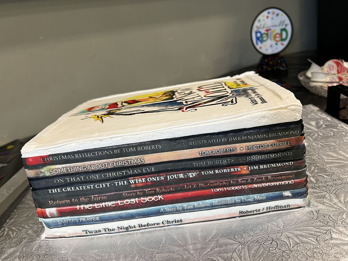 The retirement event was well-attended, with an amazing cake that appeared to be a stack of Tom’s books. The two were presented with framed gifts of children’s artwork, and a fun poem from marketing, also framed.