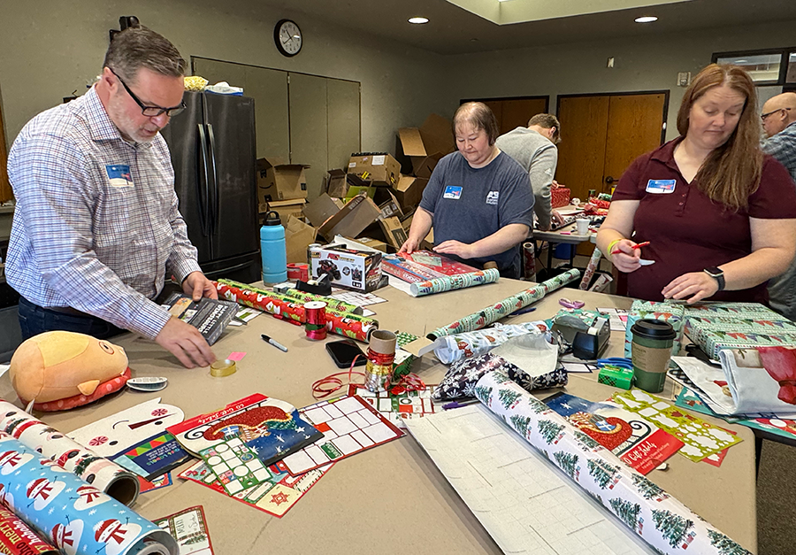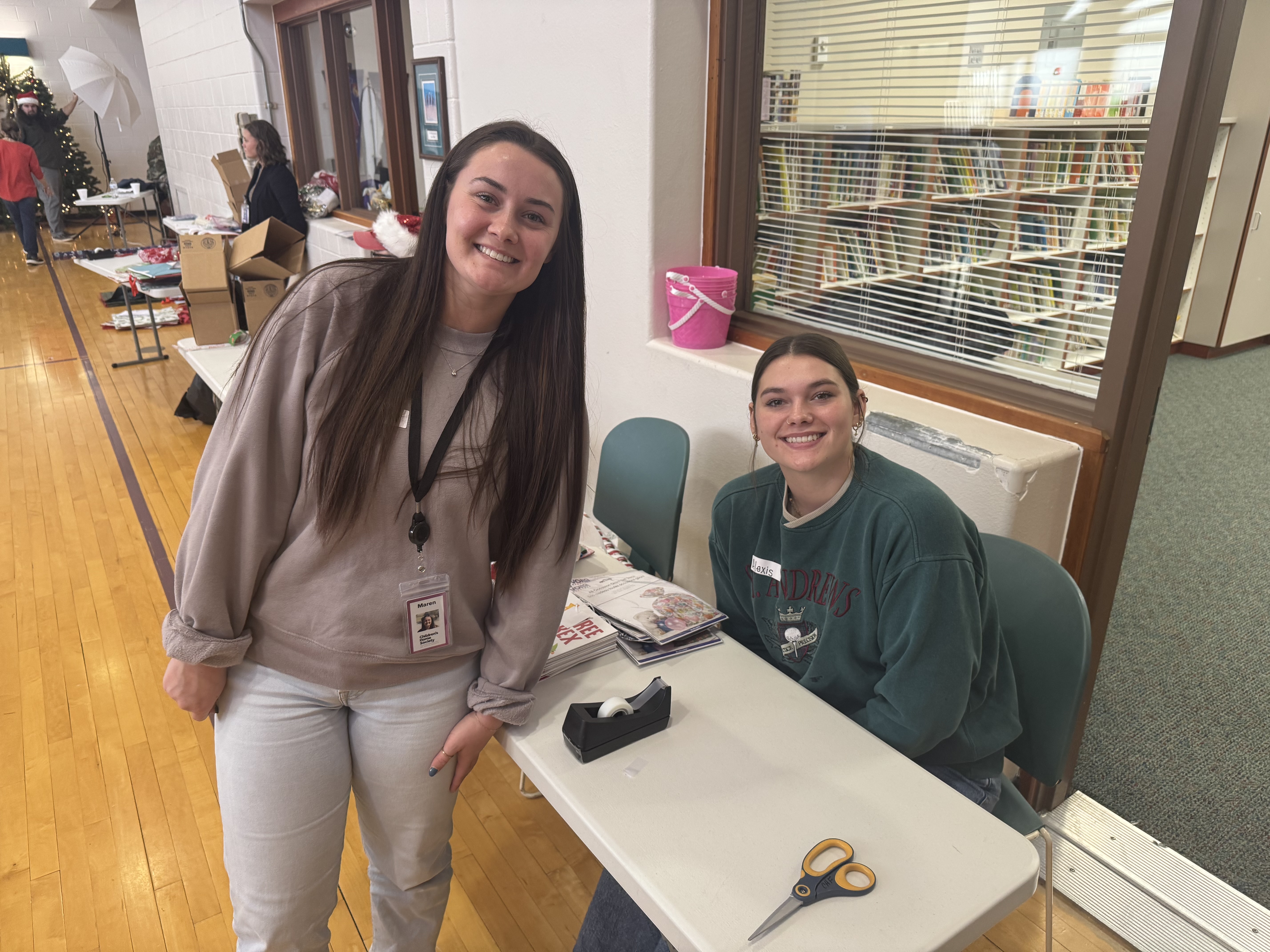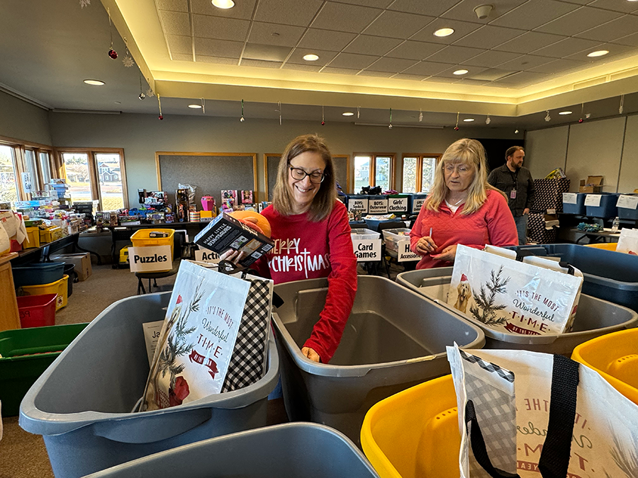 Grant Specialist Angie Smith and Purchasing Coordinator Kim Knopf organize gifts for the volunteers to wrap at the North Pole gift wrapping day.