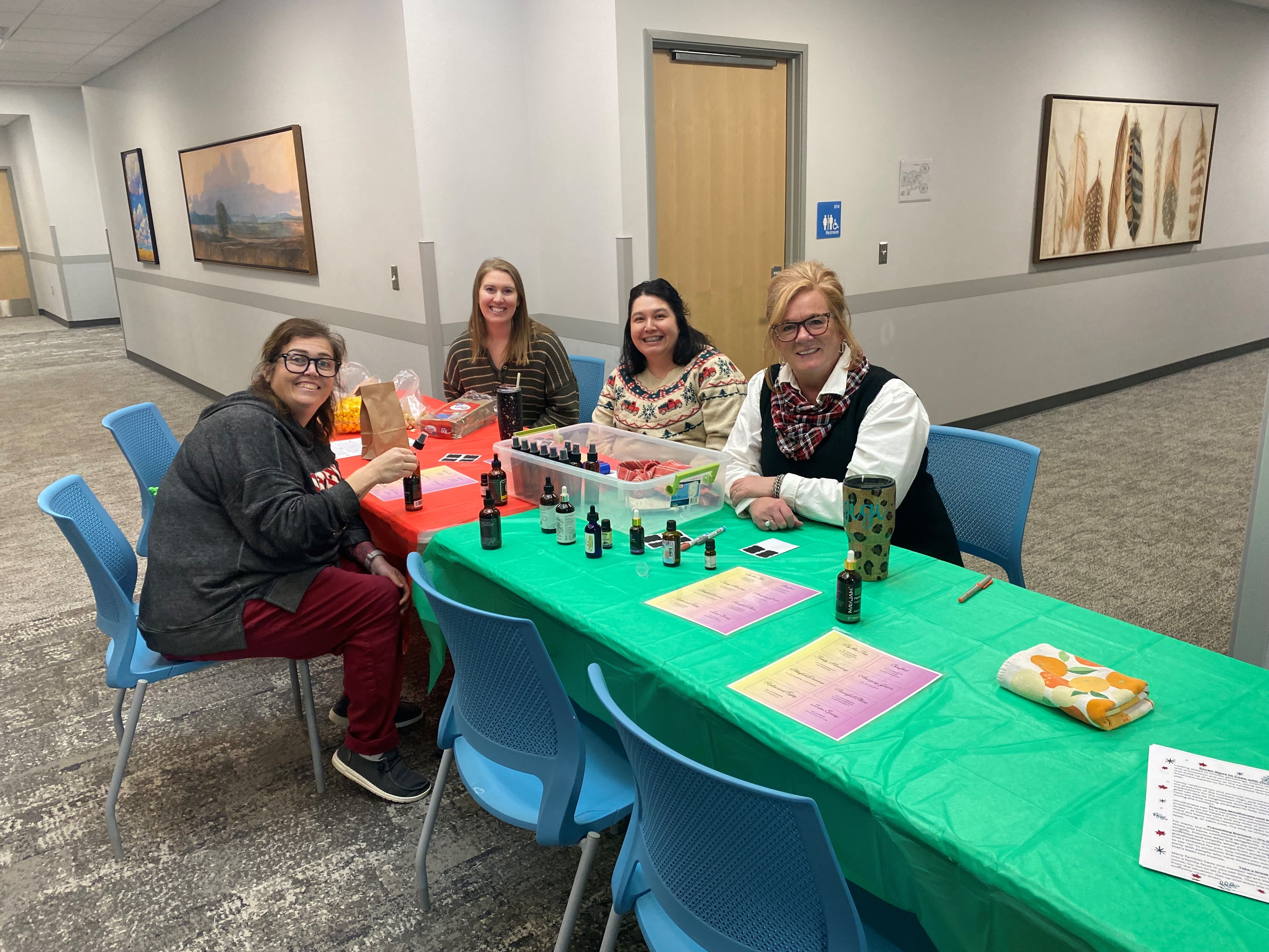 The Therapist Team at Shelter hosted a Room Spray making event for clients and staff. The three therapists Rachel Abraham, Tina Riter, and Jeanne Weyen are helped Assistant Program Director Darlene Hillmer make a bottle of room spray. They brought popcorn and everything needed to make the perfect, uplifting, or calming scent to create exactly what the individual desired.