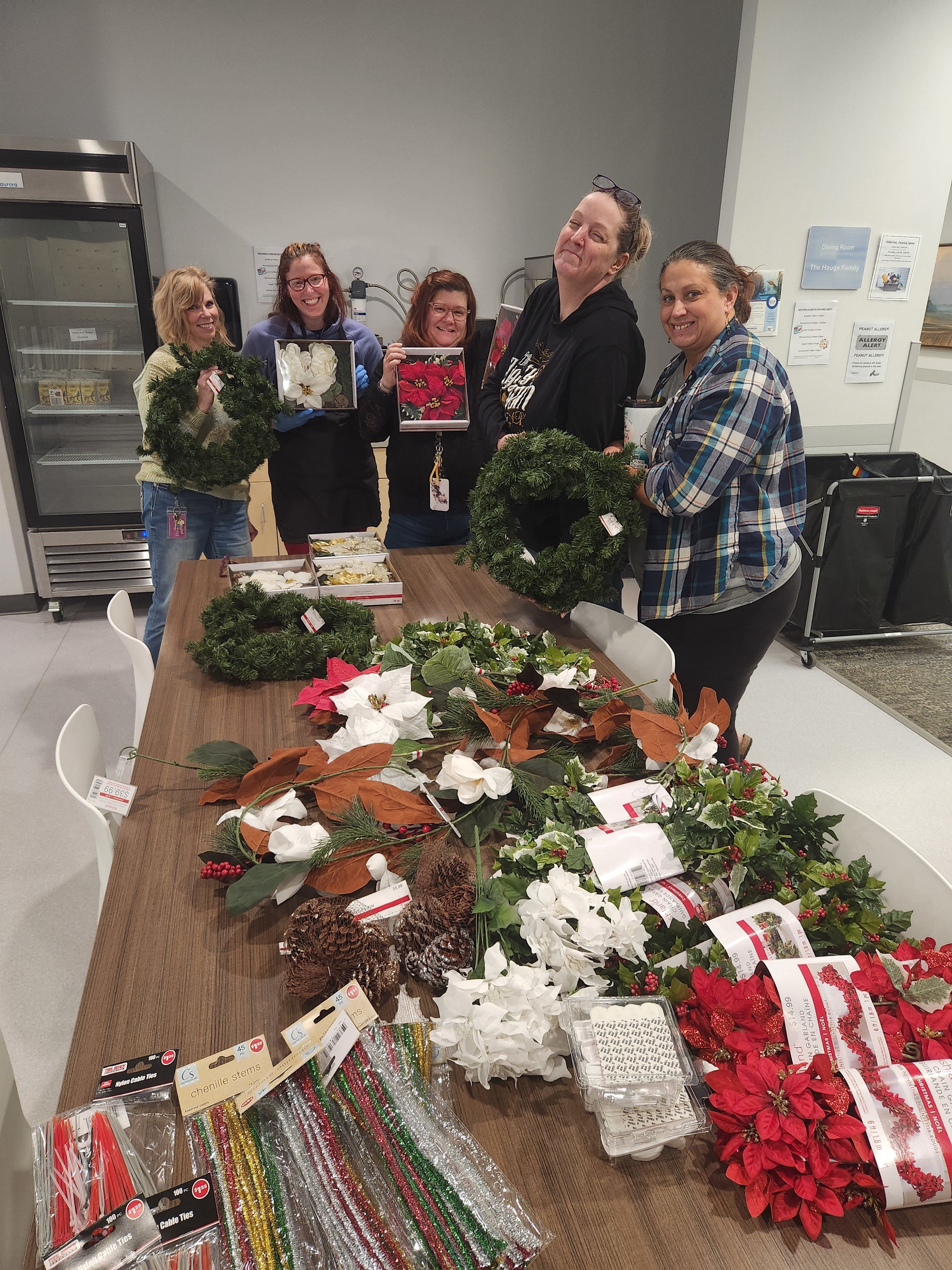 Case Managers at Shelter made wreaths with clients. Staff are pictured holding supplies as they get ready for clients to arrive for the event. Left to right: Laura Ralston, Reanna Mennis, Michelle Schroeder, Michelle Haeder, and Heather Plueger.