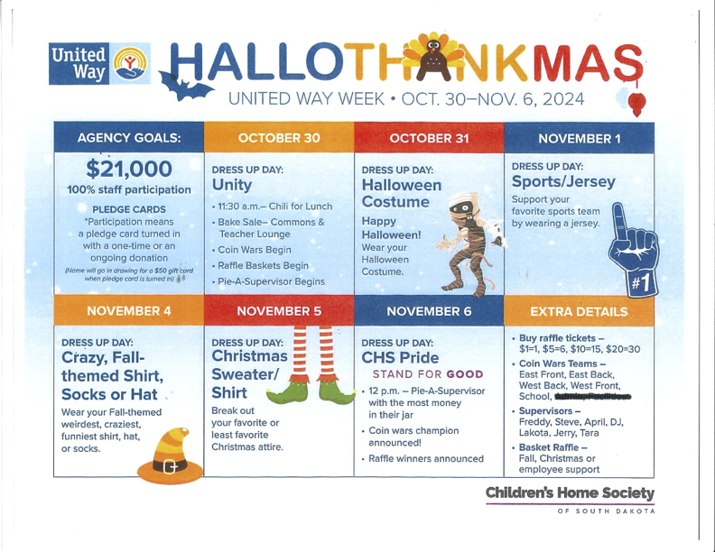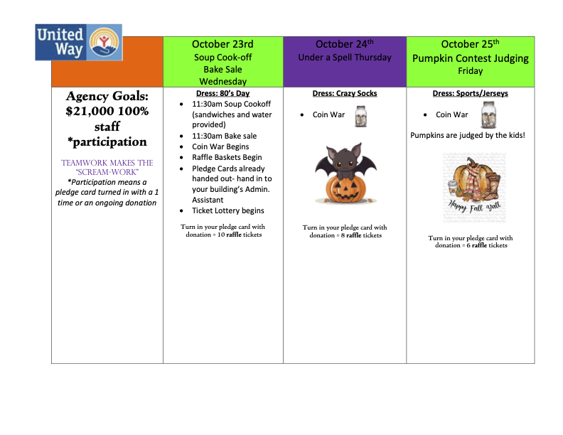SFCH crew, are you ready for a spooktacular week of fun? United Way Week will kick off this Wednesday, October 23. Don’t forget to turn in your pledge cards! The earlier you turn them in, the more raffle tickets you will get. Below are pledge card and dress-up day information.
