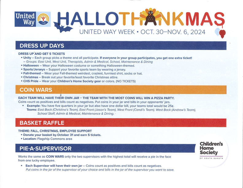 Halloween, Thanksgiving and Christmas, oh my! BHCH crew, get ready to celebrate all the holidays with your theme of HalloThankMas. You will kick off your United Way Week next Wednesday, October 30. Get excited for some fun, games and…pie? Keep an eye out for your pledge cards!