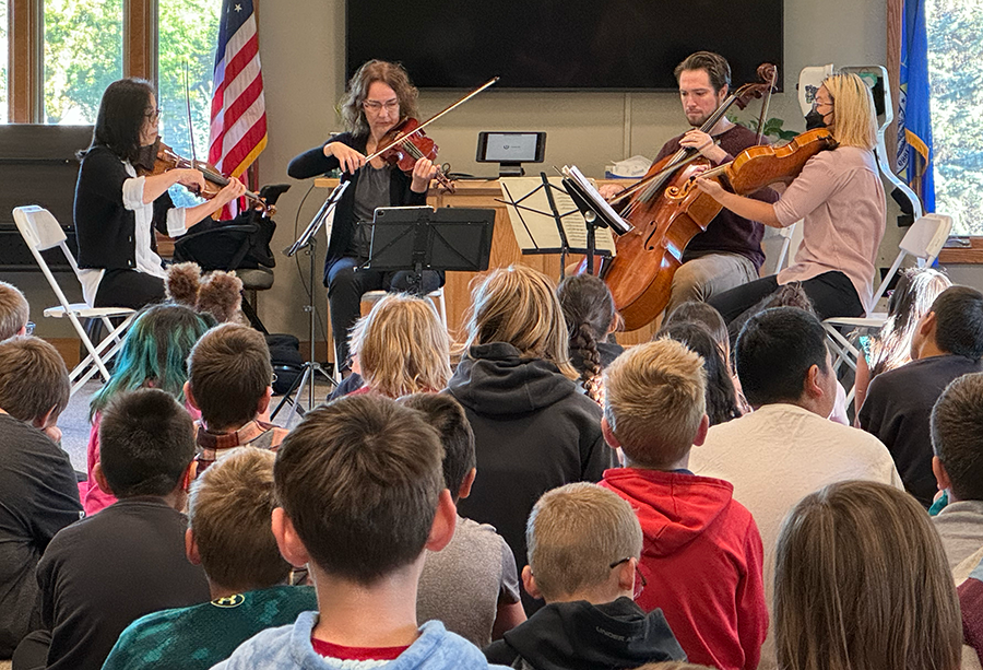 At the end of the program, the Dakota String Quartet answered questions from the audience. They explained to the kids that they all had started playing music very young, and the importance of practicing with your instrument. Of course, the best question of the day was when a child asked what the bows were made out of. Did you know they are made out of wood, horse hairs and resin? The resin on the horse hairs makes a vibration when it rubs against the strings on the instrument. Don’t worry, no horses were harmed in the making of any instrument bows–the kiddos made sure to ask!