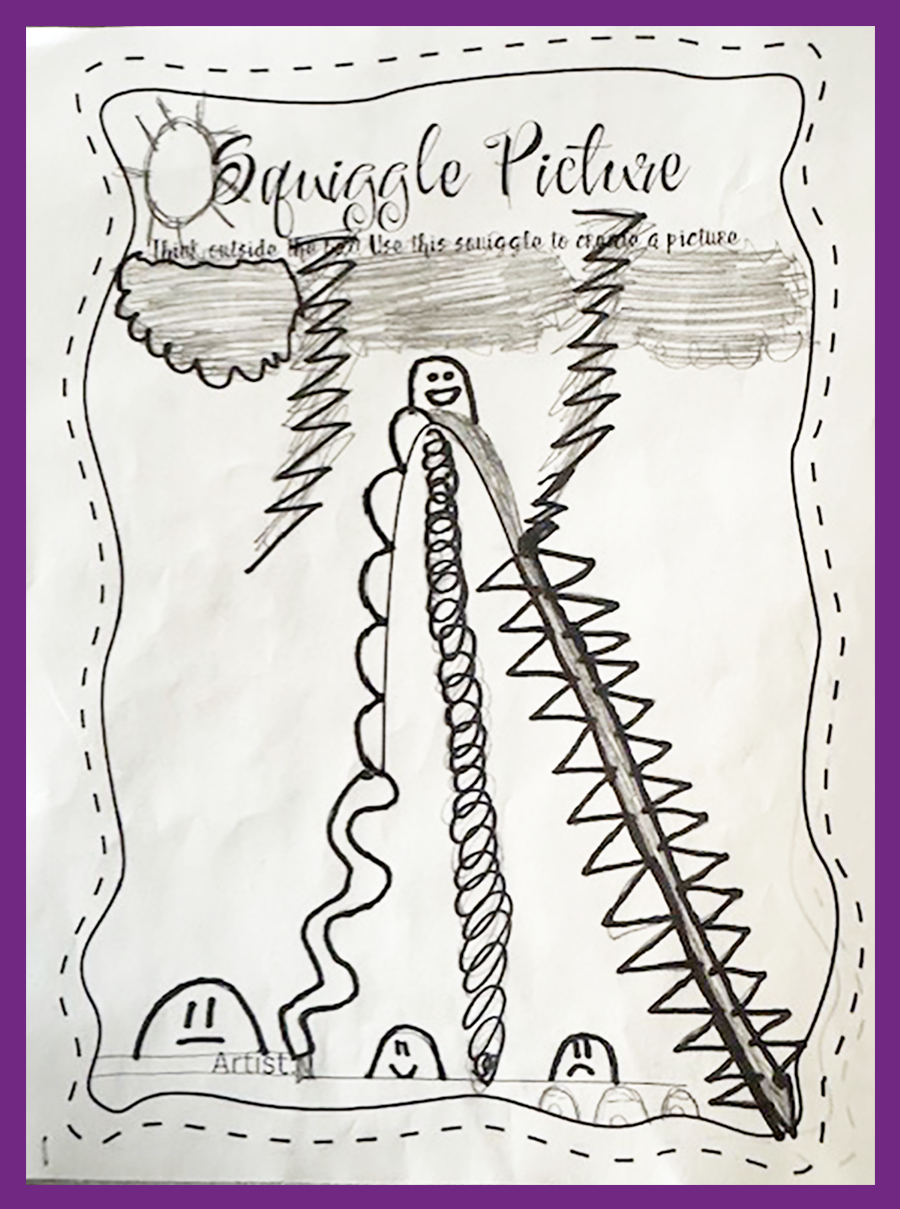 Loving School Teacher Assistant Paige Knuth and Classroom Teacher Intern Kaela Larkin handed each student a sheet of paper with a small squiggle on it. They asked students to complete the drawing and write a story to accompany their art.