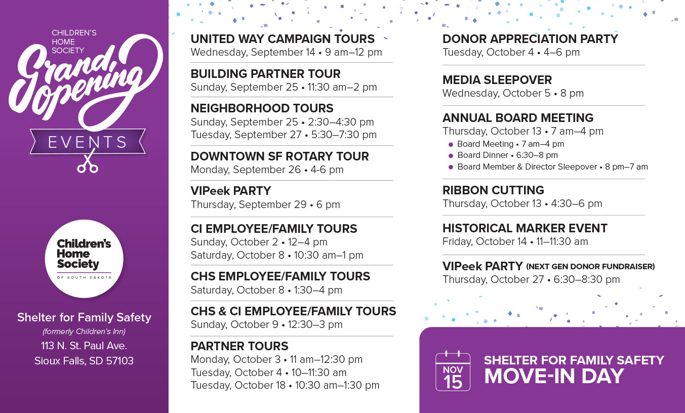 You are invited to attend Children's Home Shelter for Family Safety (formerly Children’s Home Shelter for Family Safety) Grand Opening Events! Check out the various events scheduled for the new Shelter for Family Safety building! You have several opportunities to tour the new facility and everyone is invited to the Chamber Ribbon-Cutting on October 13.